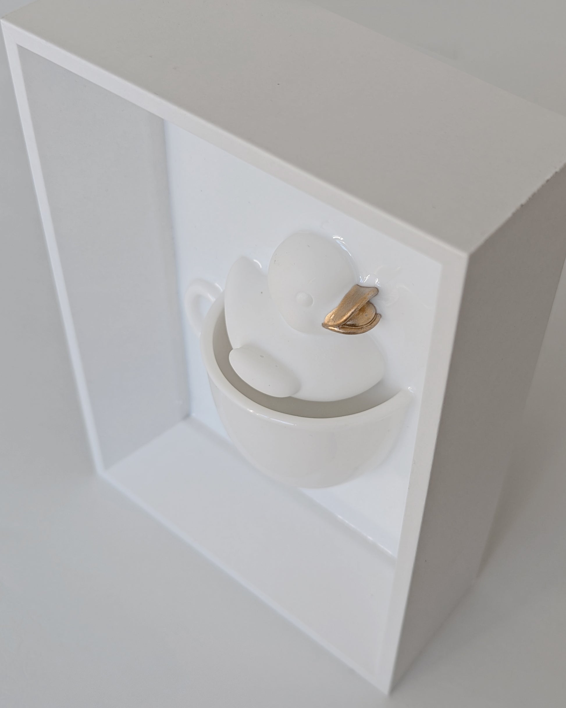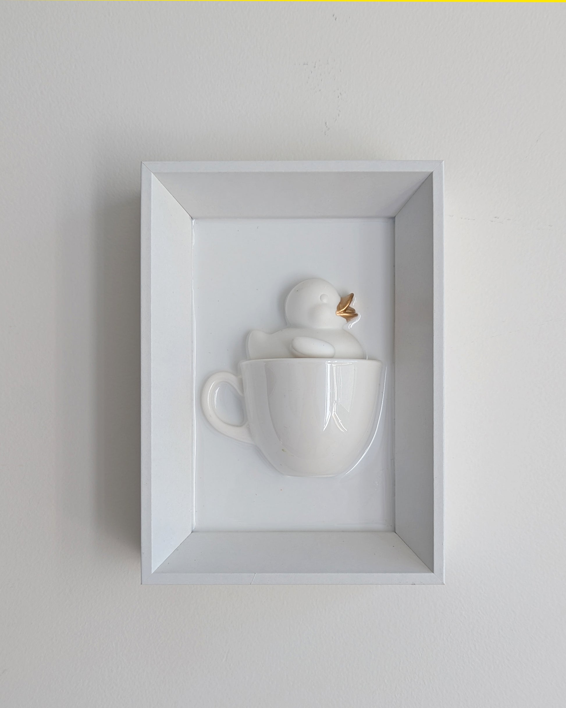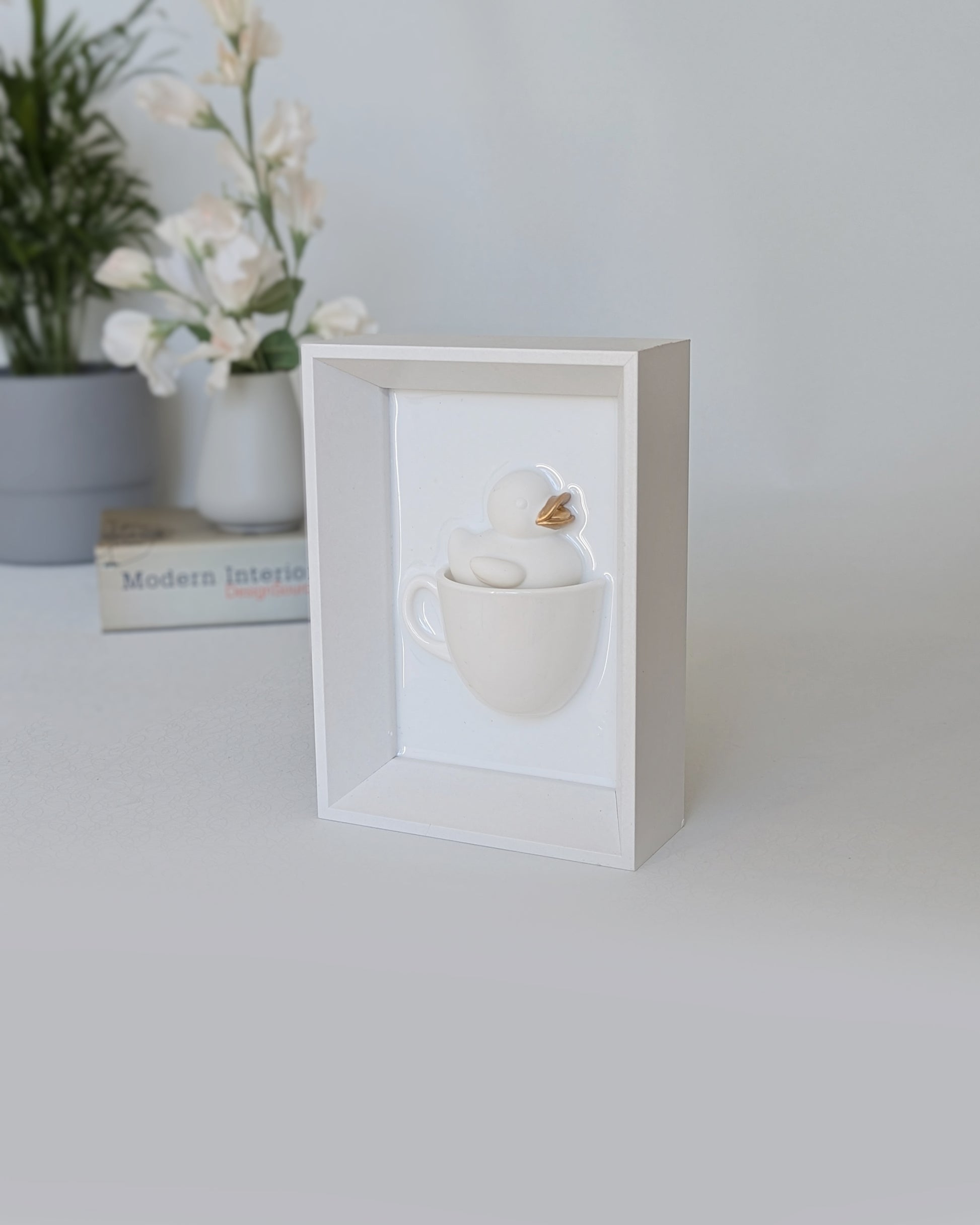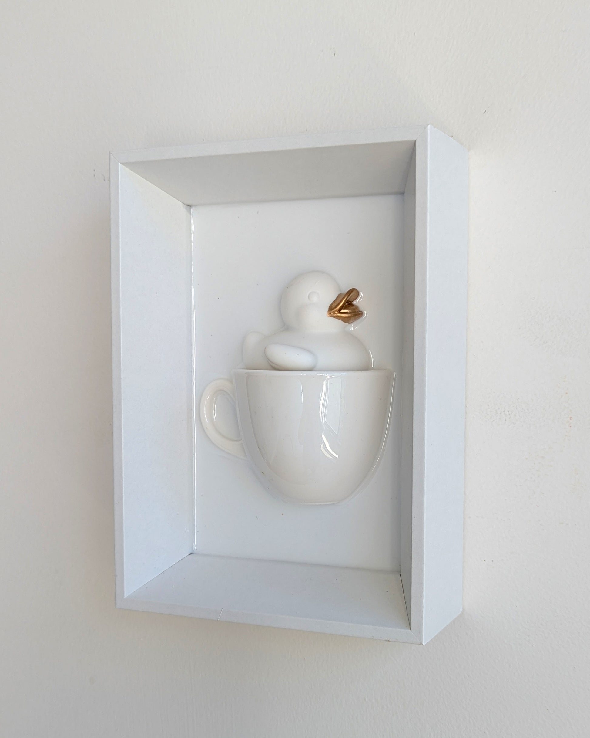 ברווזון בכוס קפה. יצירה שתוסיף נגיעה של שובבות וצבע לכל פינה בבית, במשרד או בכל חלל שתבחרו (גם בחדר האמבטיה), ותגרום לכולם לחייך.