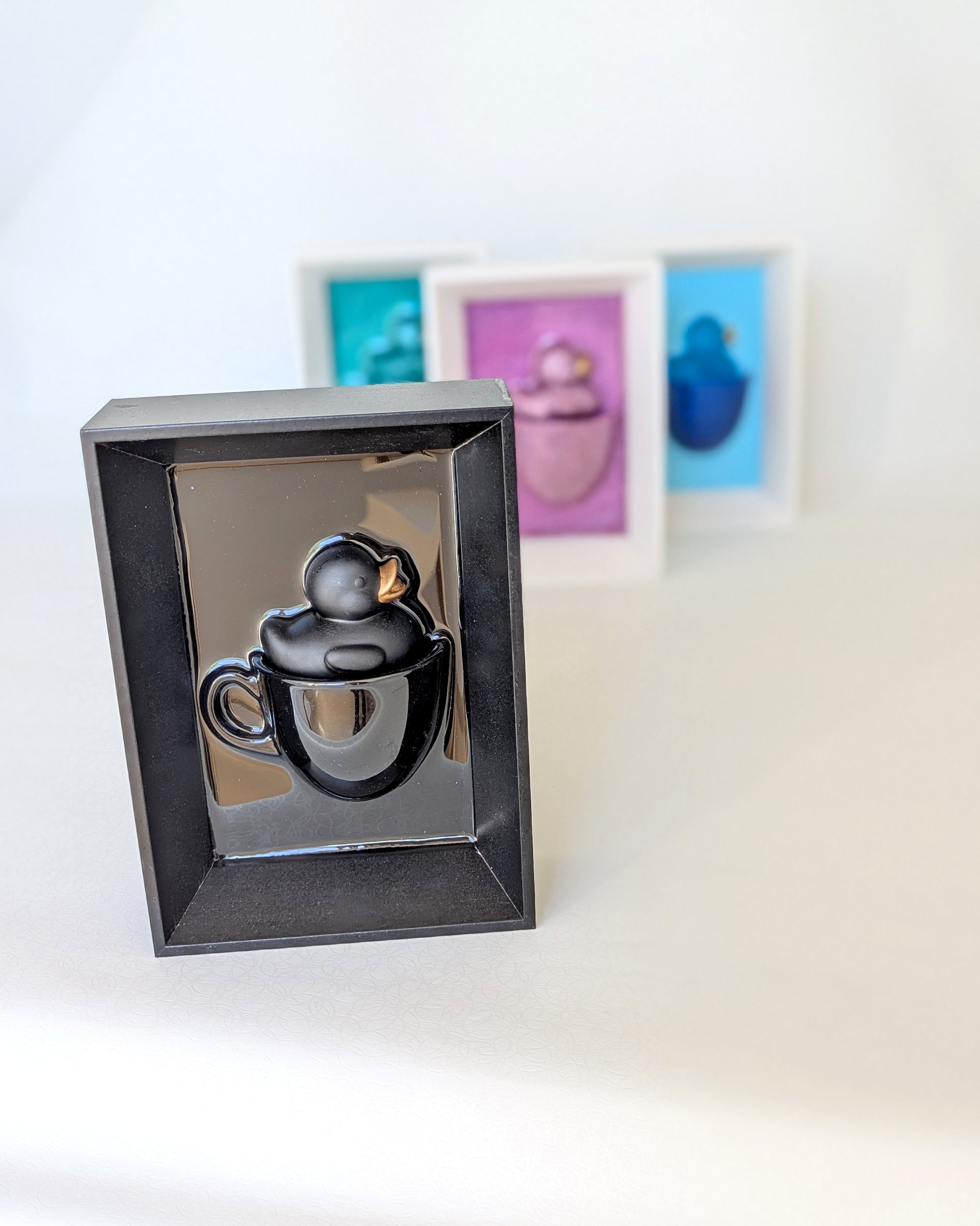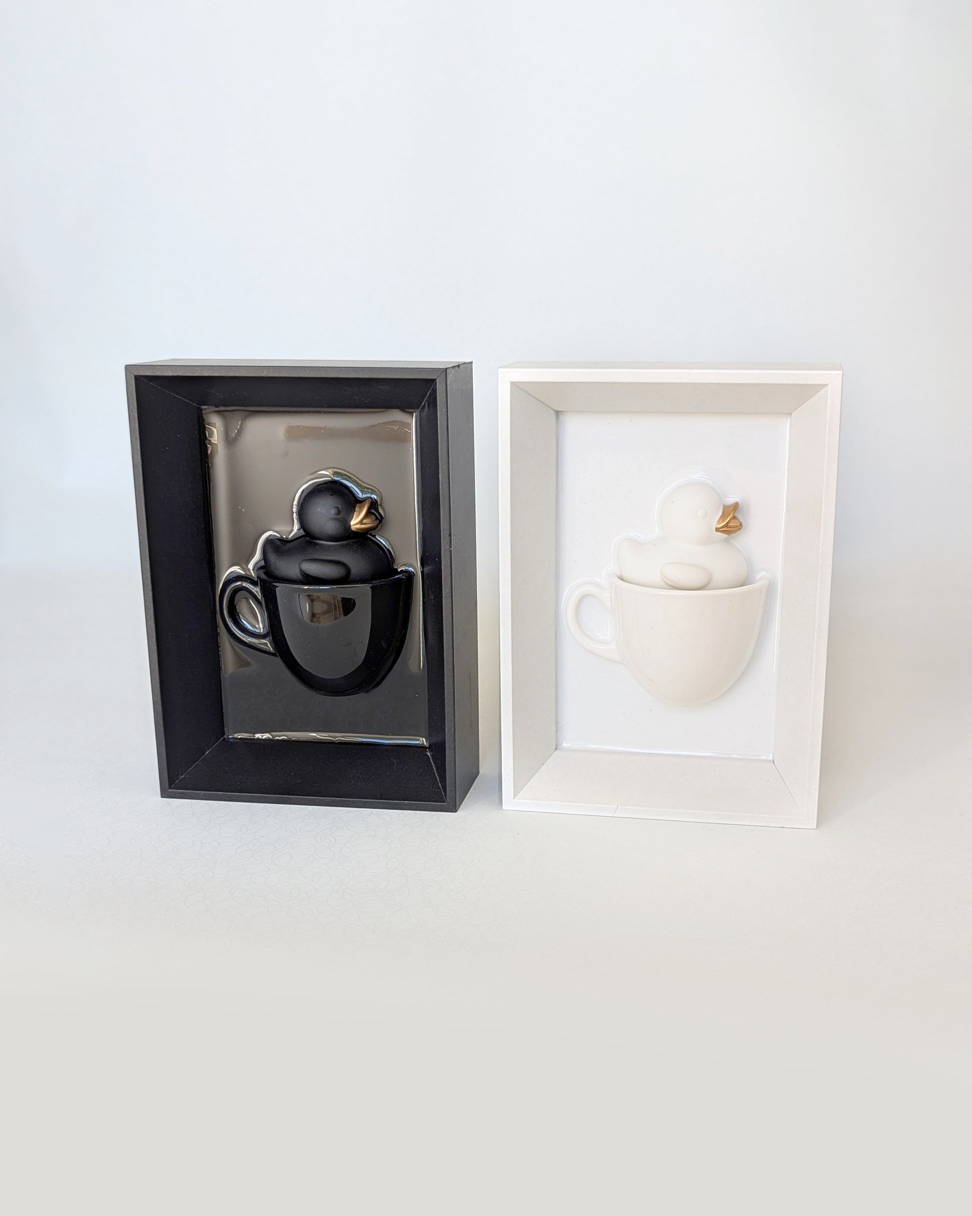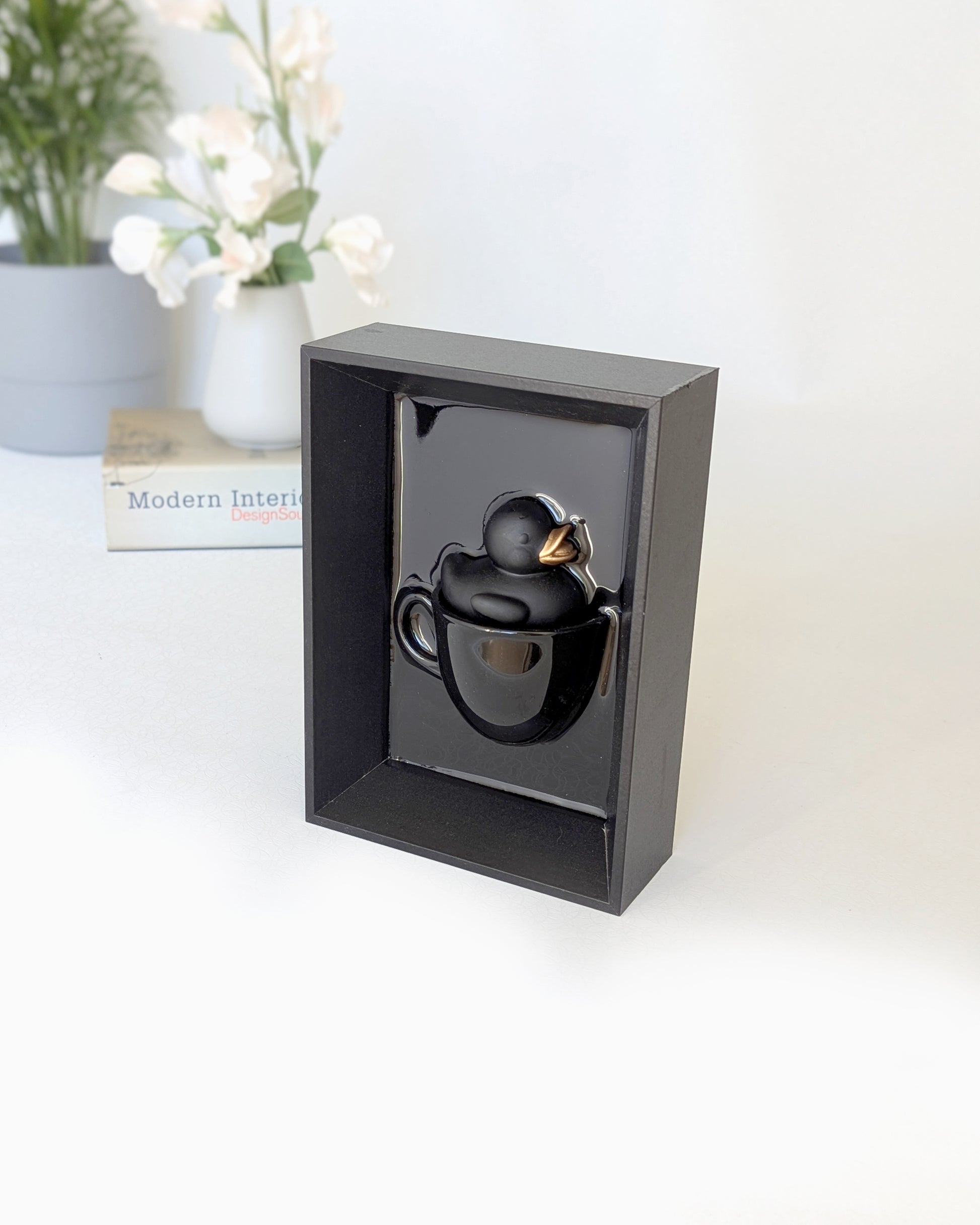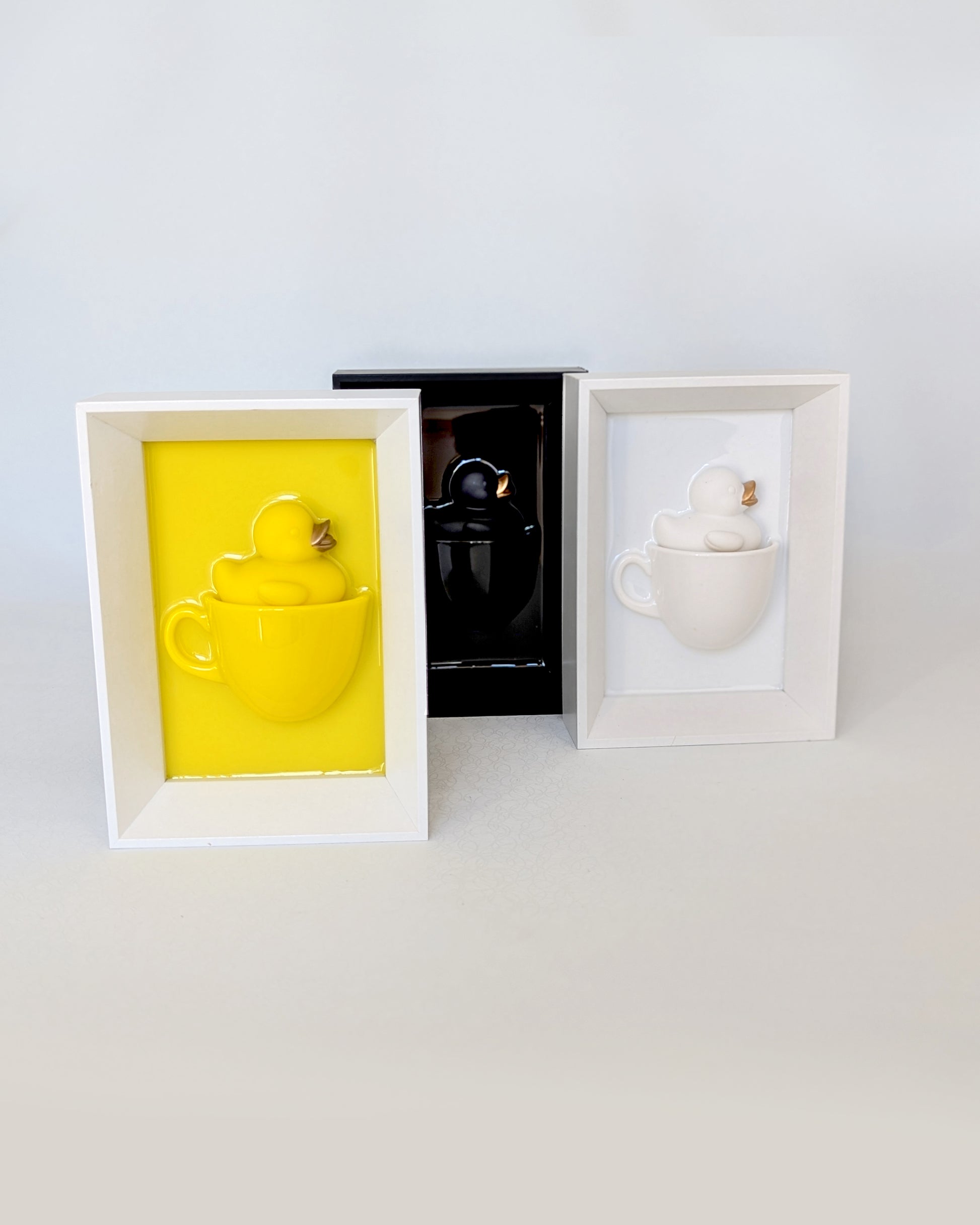 ברווזון בכוס קפה. יצירה שתוסיף נגיעה של שובבות וצבע לכל פינה בבית, במשרד או בכל חלל שתבחרו (גם בחדר האמבטיה), ותגרום לכולם לחייך.